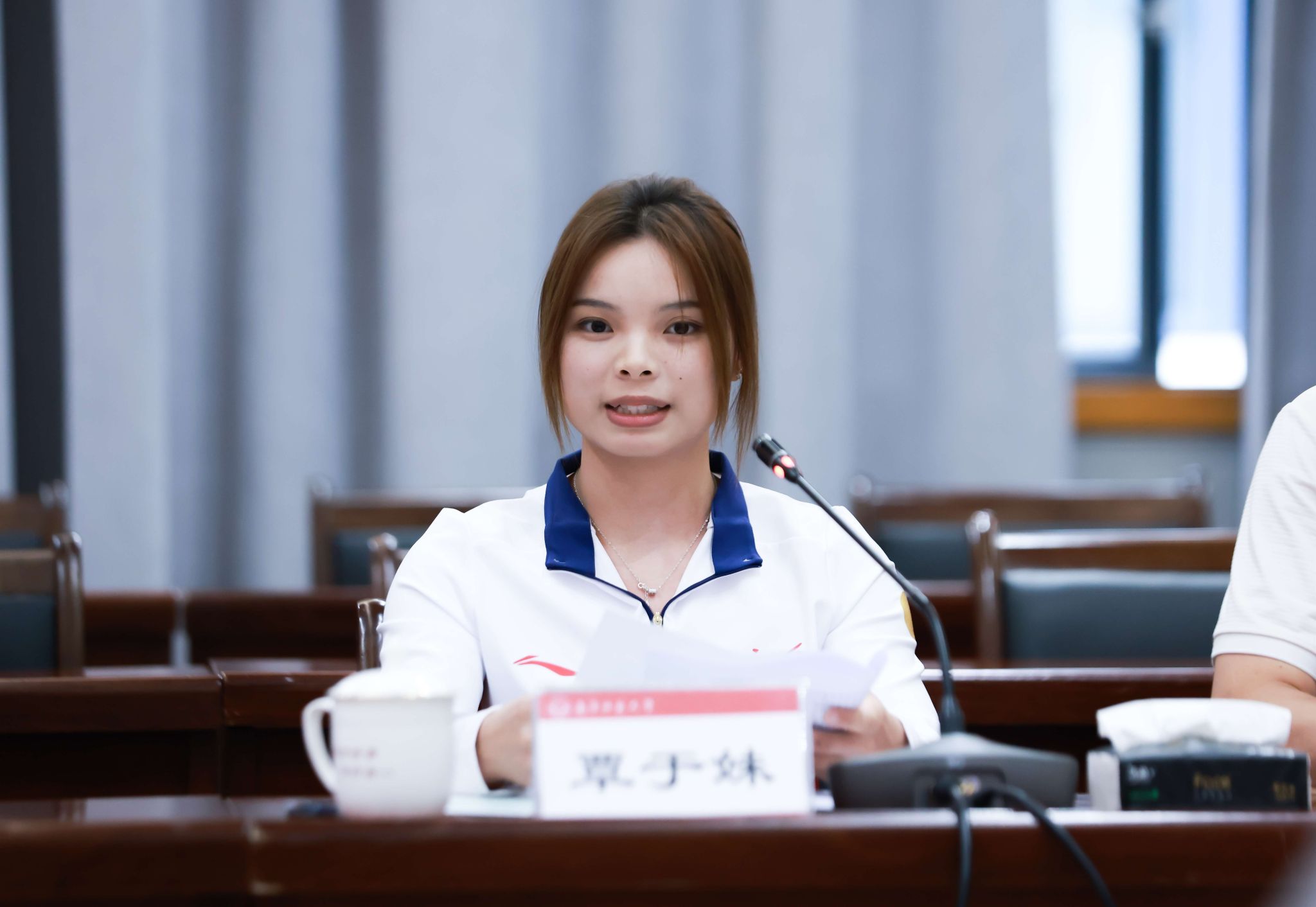 作为座谈交流的重要一环,新入学的2025级运动训练专业学生、广西优秀攀岩运动员覃于妹分享了她的感受及未来的学业规划,并特别感谢自治区体育局的培养与输送,也感谢南宁师范大学提供的宝贵学习机会,表示将珍惜校园时光,努力实现运动成绩与学术修养的双重提升,继续为广西和国家争光。