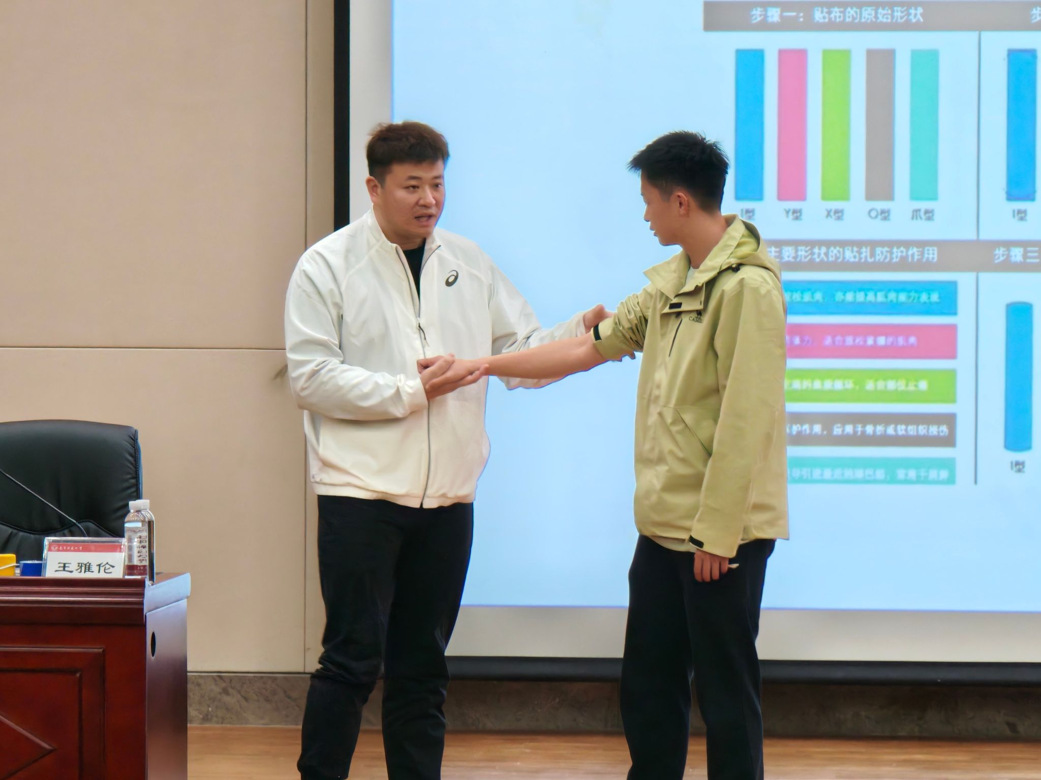讲座围绕“运动损伤预防、现场应急处理、科学康复指导”三大主题展开,紧密结合体育专业学生的日常训练实际。王雅伦老师结合多年教学与训练经验,系统讲解了踝关节扭伤、肌肉拉伤等常见运动损伤的发生机制与预防要点,并重点介绍了国际通用的RICE(休息、冰敷、加压、抬高)应急处理原则。通过真实案例,他逐一剖析了学生在日常处理中容易出现的不规范行为和认知误区,强调科学的防护意识与熟练的急救技能不仅是保障自身安全的重要基础,更是未来从事体育教育工作所必备的职业素养。