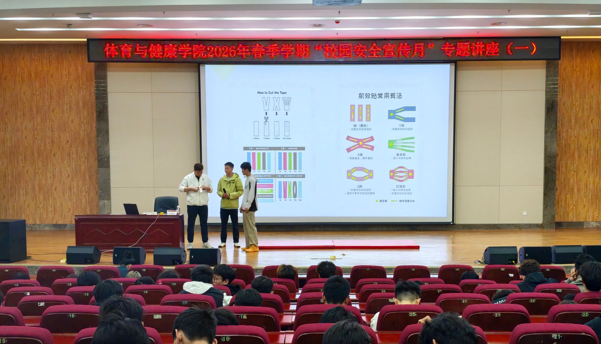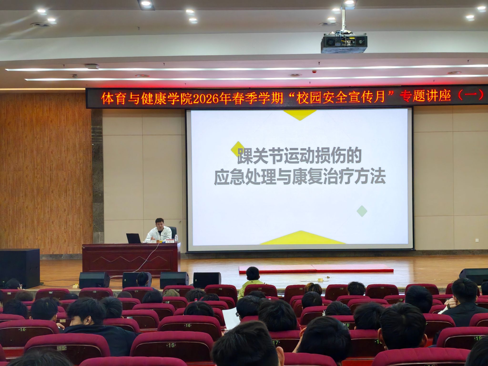 2026年春季学期“校园安全宣传月”首场专题讲座在武鸣校区图书馆报告厅顺利举行。本次讲座特邀我校专业教师(原国家田径短跑队、广西田径运动发展中心康复治疗师及队医)王雅伦老师担任主讲,学院2023级、2025级本科生及研究生共300余人到场学习,现场气氛热烈,互动积极。
