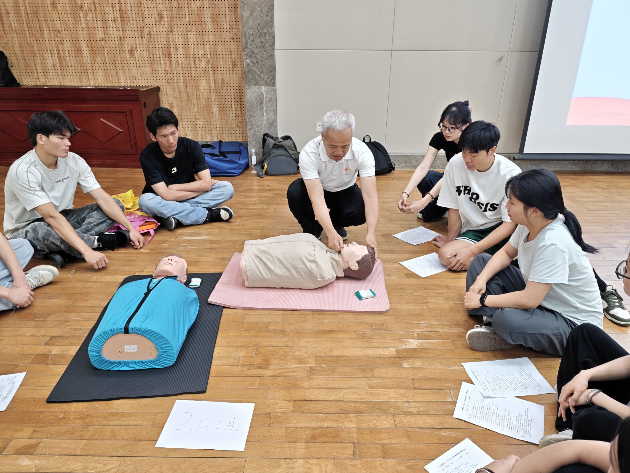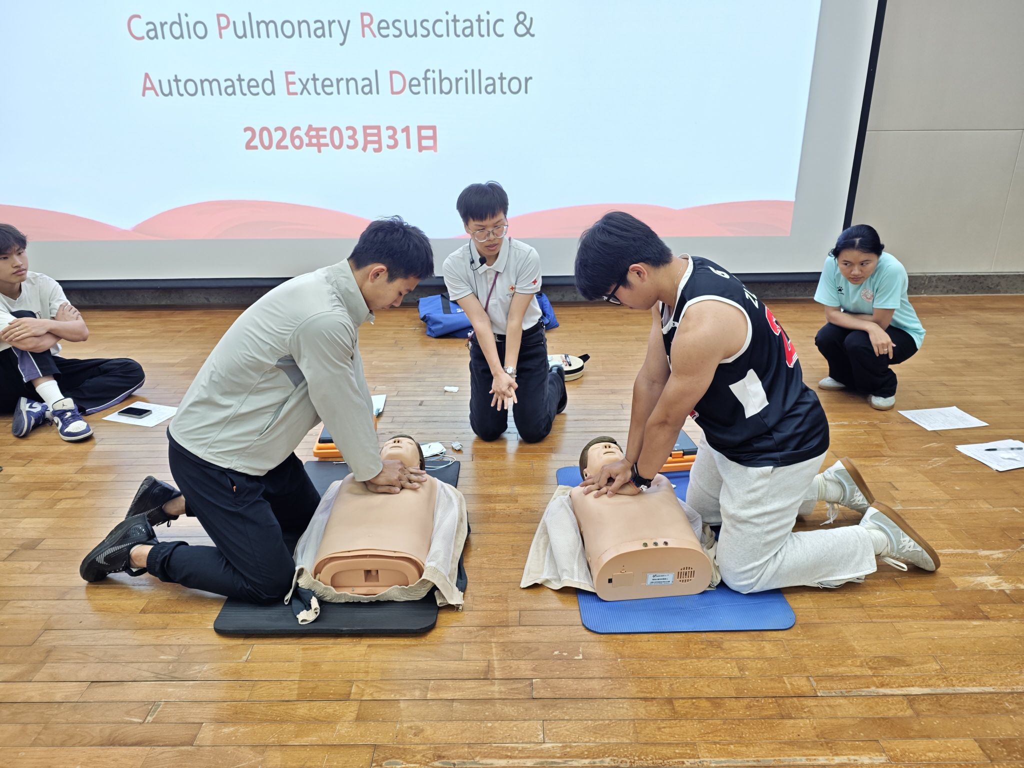 培训特邀红十字会资深应急救护讲师担任主讲,围绕心肺复苏(CPR)、AED使用、创伤包扎、海姆立克急救法等校园高频急救场景,展开系统而深入的教学。讲师结合真实生动的案例,细致讲解急救原则、操作规范与注意事项,并通过示范演示与手把手指导,帮助参训师生迅速掌握核心施救技能。